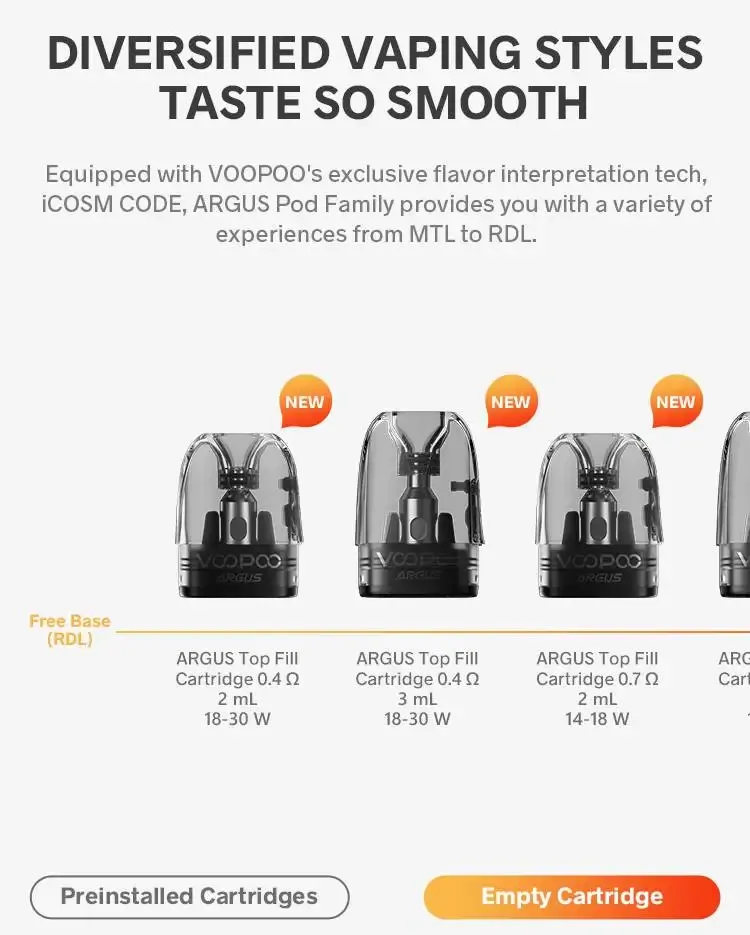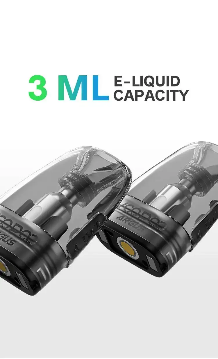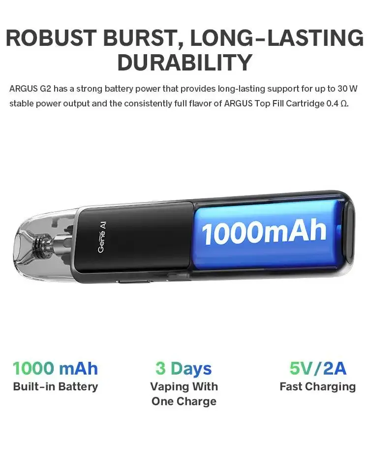 The ARGUS G2 kit equips a fully upgraded new cartridge, the ARGUS TOP Fill Cartridge. It features a 3 mL capacity, 30 days without leakage, 90 mL coil lifespan, and convenient top-filling to provide a smooth vaping experience. In addition, ARGUS G2 is also compatible with ARGUS POD Family devices. It is equipped with iCOSM CODE to bring users a diverse vaping experience from MTL to RDL. The ARGUS G2 is powered by a built-in 1000mAh battery, which can provide long-lasting support for up to 30W stable power output and the consistently full options of ARGUS Top Fill Cartridge 0.4Ω.