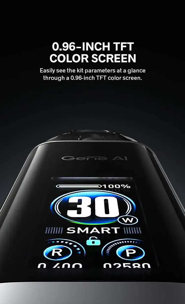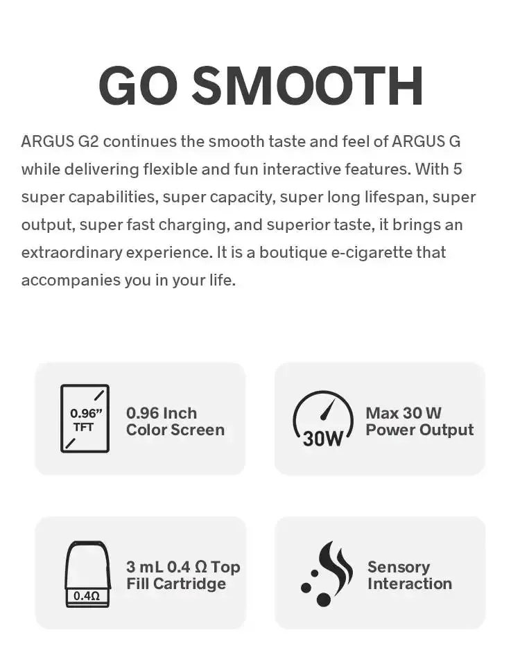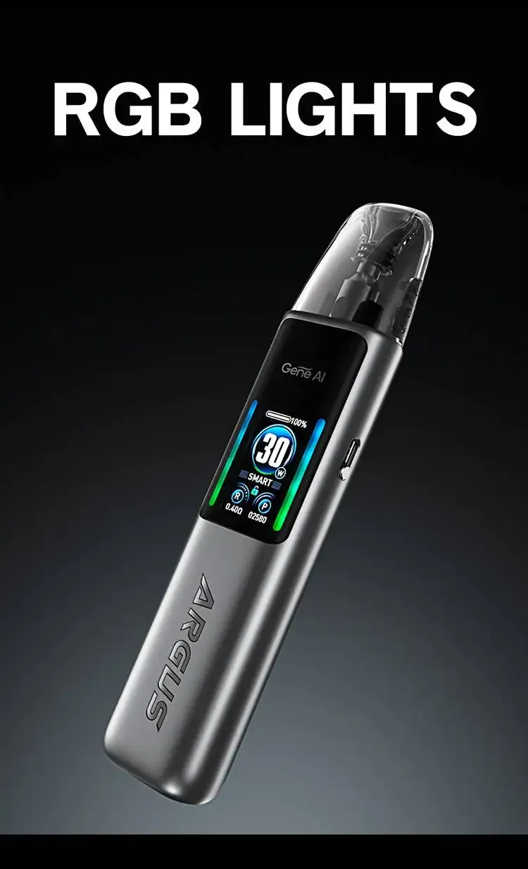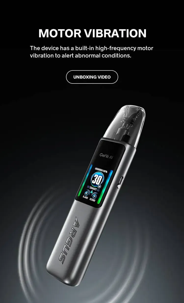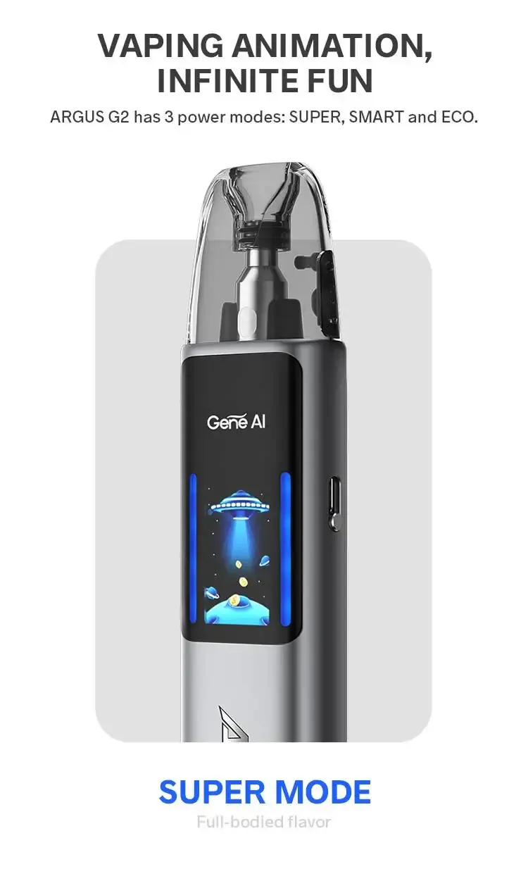 ARGUS G2 is equipped with a 0.96-inch TFT color screen, device parameters are easy to know at a glance. Meanwhile, the UI interaction is more interesting. With 3 power adjustment modes – SMART, SUPER, and ECO, ARGUS G2 provides 3 UI interface choices and presents 3 animations including flames, flying saucers, and colorful cups. With two RGB LED lights on the device, users can freely control the status of the light bars; the built-in high-frequency vibration motor can remind the abnormal status of the cartridge and the device in time, bringing users a smooth control experience.