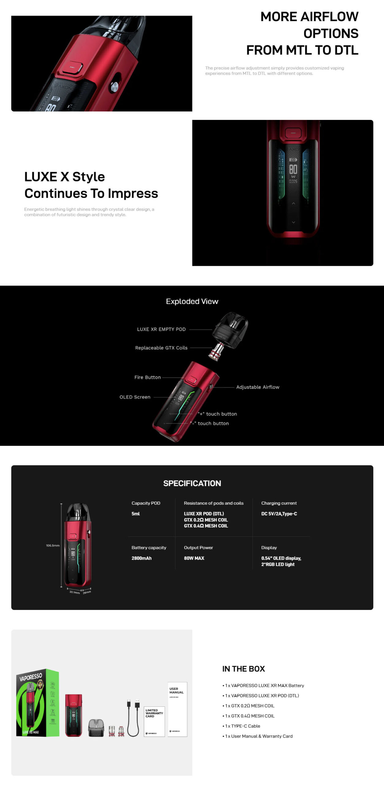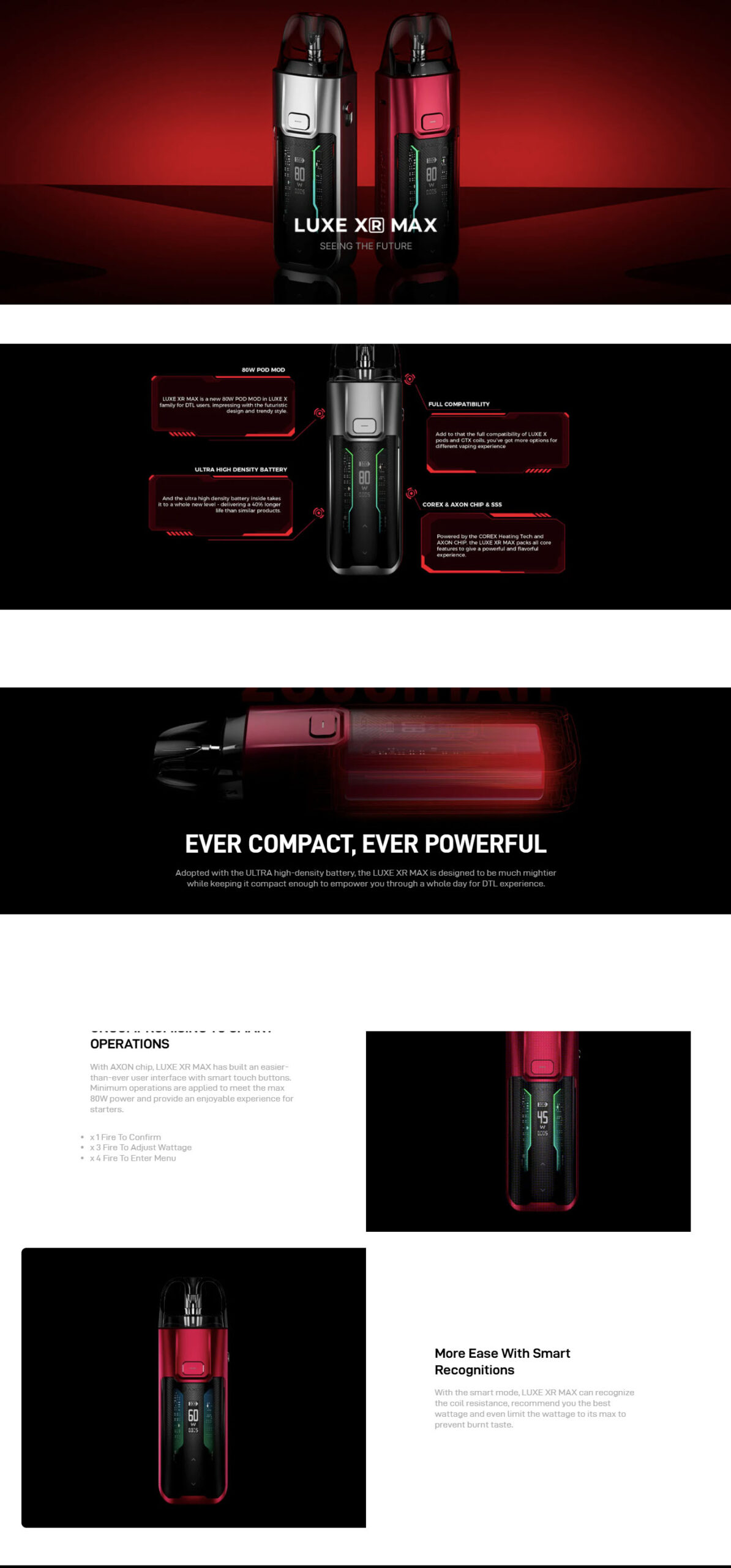 Adopted with the ULTRA high-density battery, the LUXE XR MAX is designed to be much mightier while keeping it compact enough to empower you through a whole day for DTL experience