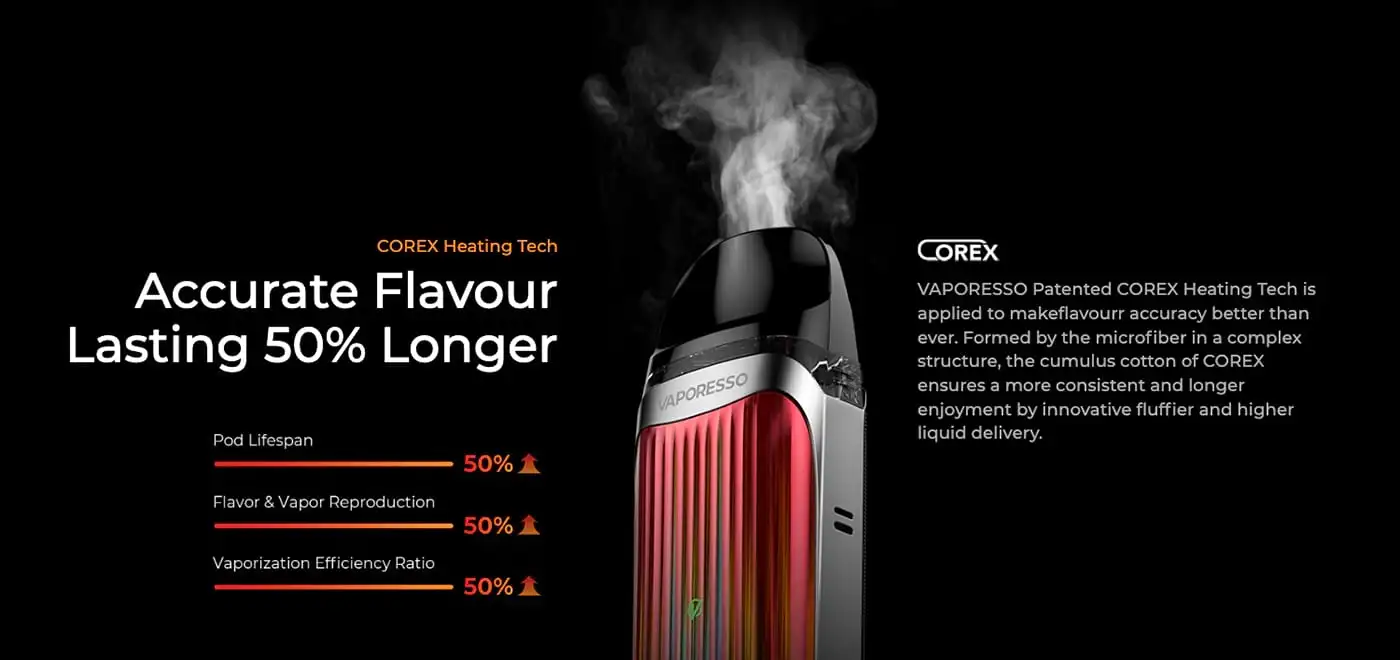 COREX is the most innovative heating technology from Vaporesso, committed to providing the best vaporisation and use of your desired e-liquid, satisfying different vaping needs with up to 50% longer-lasting flavour.