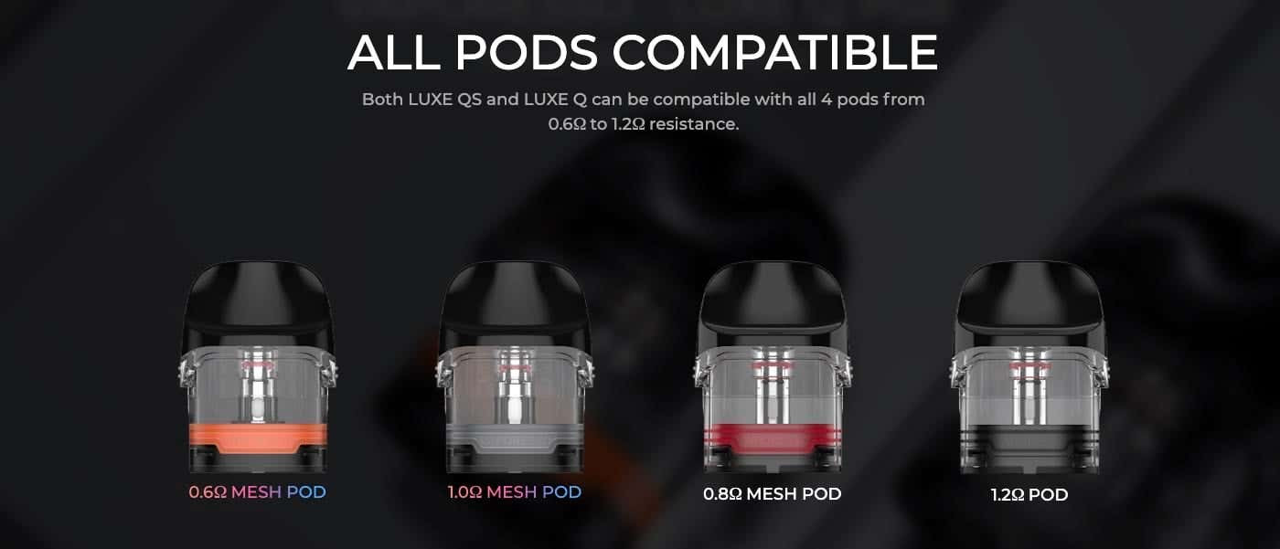 The Luxe Q range of four different pod options is compatible with both Luxe QS and Luxe Q pod vaping devices.