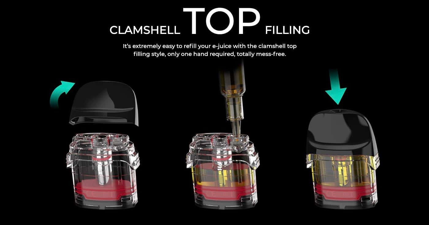 Vaporesso Luxe Q pods feature a clamshell top-filling design, making it extremely easy to refill your e-liquid by popping the clamshell top off to locate the filling hole.