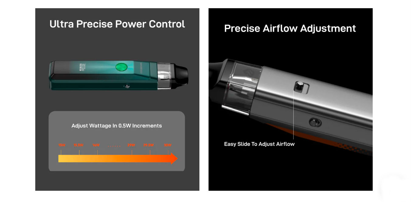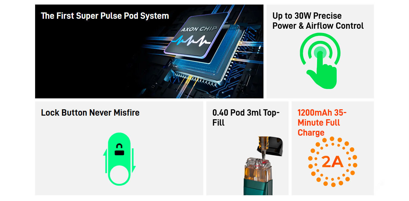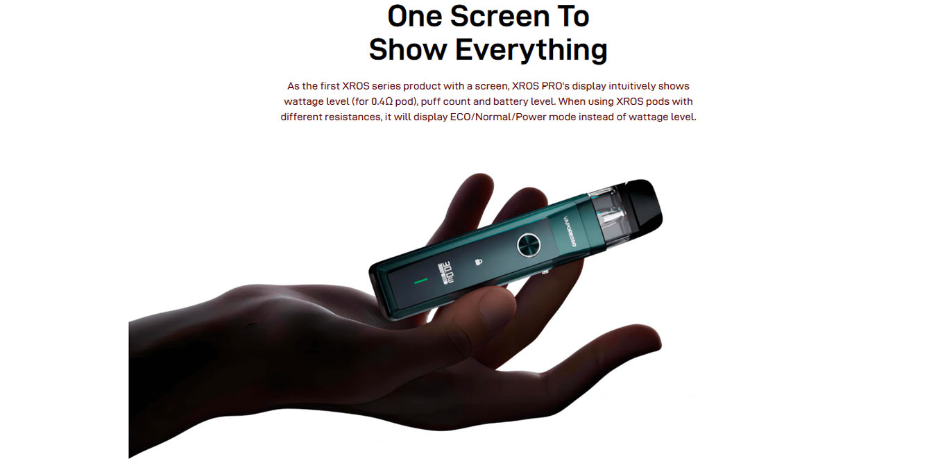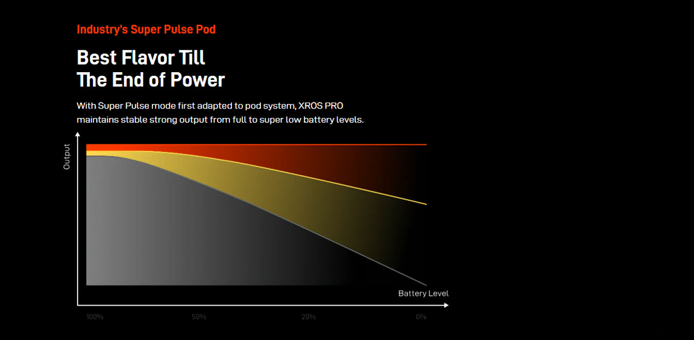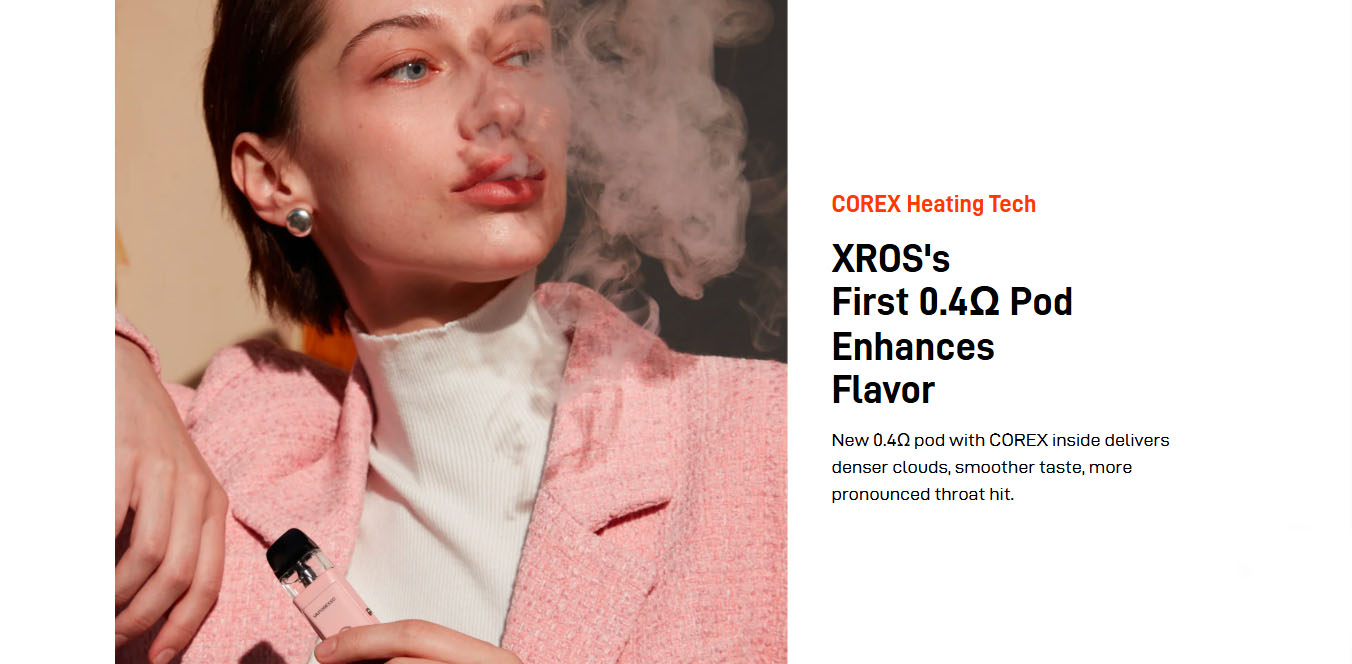 XROS PRO is the first to feature a 0.4Ω pod and adjustable power up to 30W in the XROS series, offering an RDL Pod experience. Crossing the limits to pro experience of excellent flavor, it features AXON Super Pulse mode and COREX Heating Tech. Crossing the limits to pro experience of refined operation, it features the practical screen and button. Crossing the limits to pro experience of stress-free capacity, it features 3ml top fill pod and 1200mAh battery. Moreover, it’s compatible wit added convenience